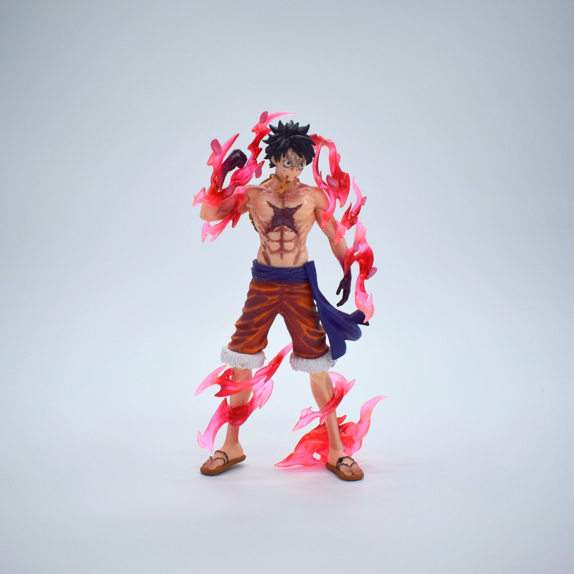 Surrounded by translucent red flame effects representing Gear 2 energy and Haki activation, this figure brings movement, aggression, and realism into a compact yet powerful display piece — perfect for collectors who value detail over size.